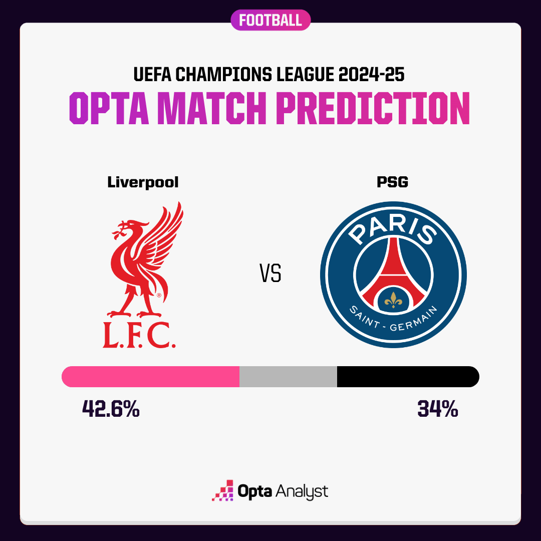 所以,在Opta给出的本场预测中,其实也是稍微倾向了主队--利物浦胜,42.6%;巴黎胜,34%;双方平局,23.4%。