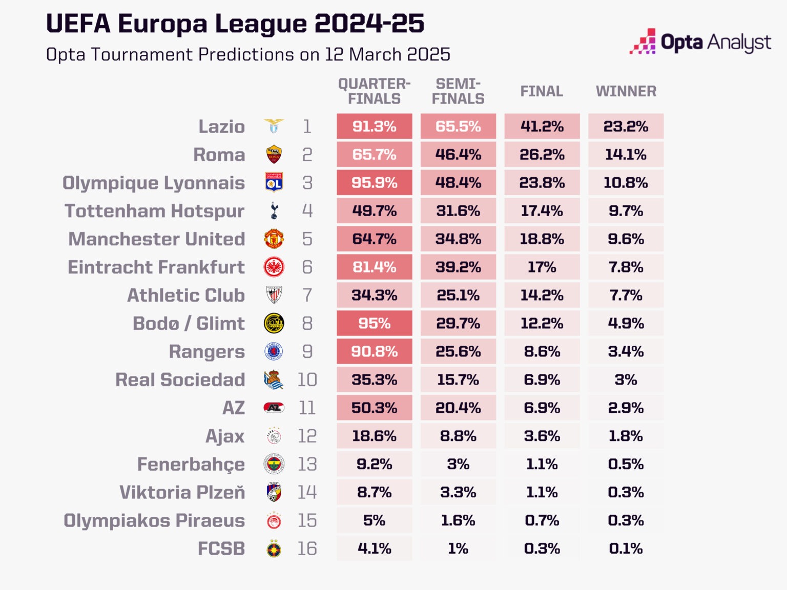 Opta欧联杯夺冠预测:拉齐奥&罗马位居前二,曼联仅排第五位