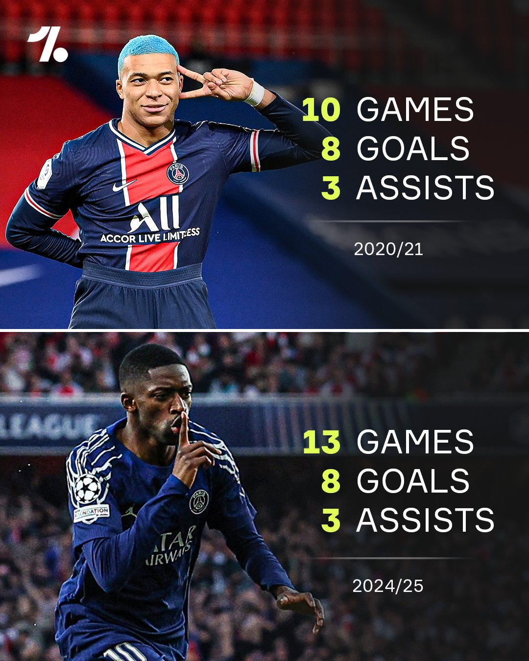 而在本场比赛之后,登贝莱也追平了姆巴佩所创造了巴黎球员单赛季欧冠制造进球的纪录--在20/21赛季,姆巴佩代表巴黎在10场比赛中贡献了8球3助攻的成绩单,而本赛季的登贝莱目前也在13场比赛后完成了此成就。