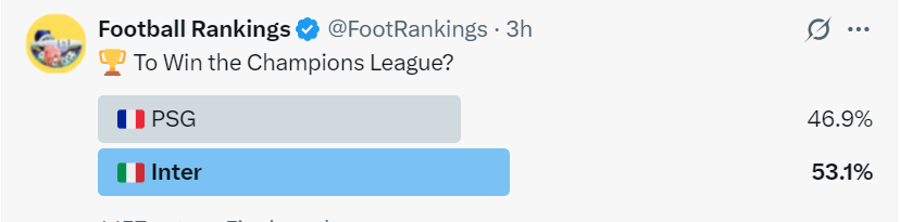 来自于Football Rankings的更新统计来看,国米则是以53.1%的概率小幅领先巴黎的46.9%。