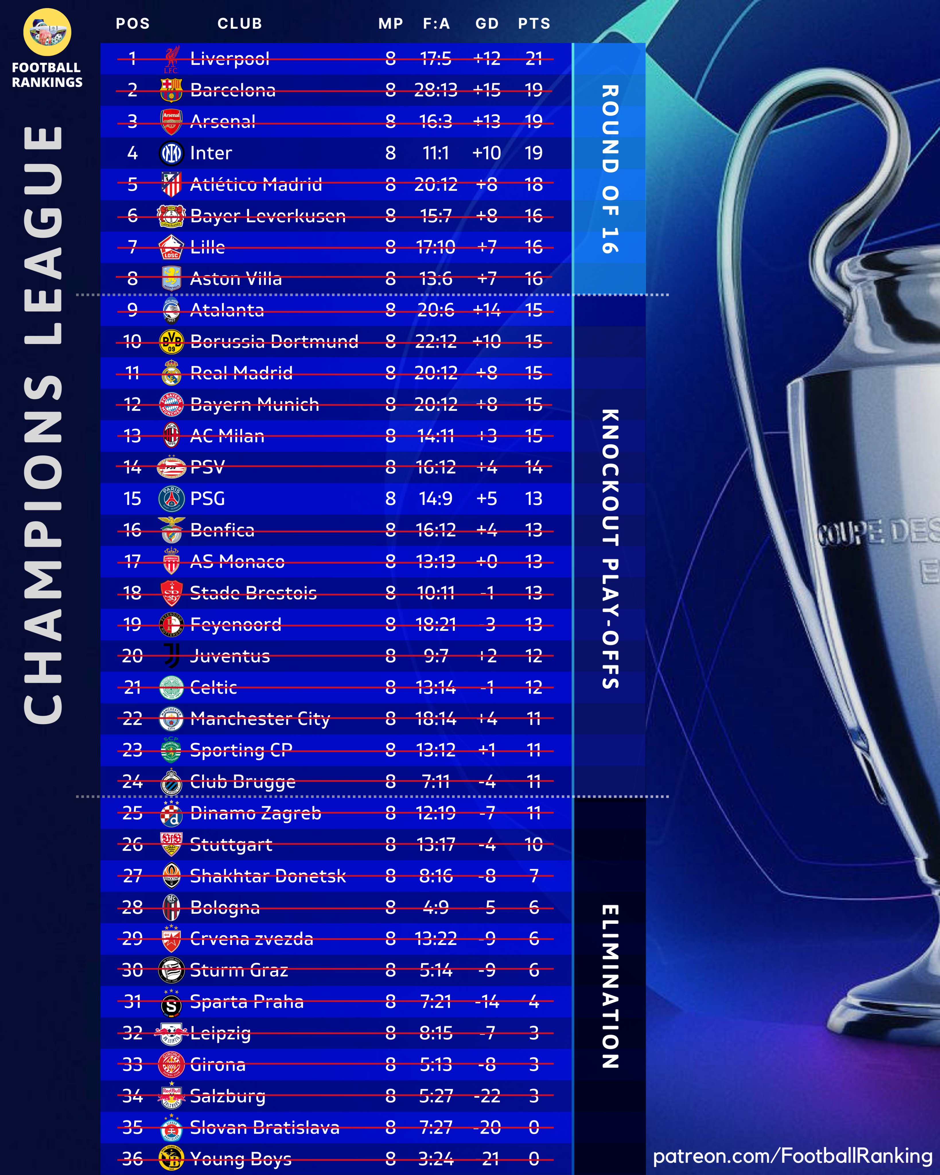 而像皇马,曼城和拜仁等豪门,在联赛阶段的发挥均谈不上出色和稳定,仅仅位列第9-24这个区间的排名,更终让他们进入了淘汰赛附加赛的序列。