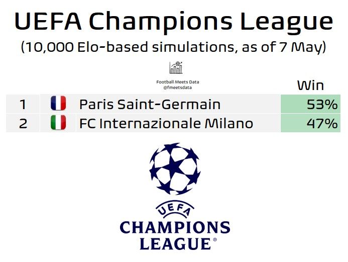 而根据足球数据网站Football Meets Data更新发布的预测概率来看,巴黎目前以53%的概率微弱领先于国米的47%;