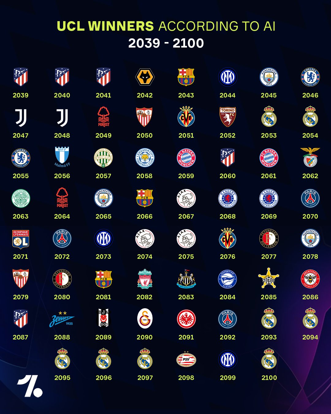 那么,对于接下来的2026直至2100年的欧冠结果,AI又能命中几许呢?
