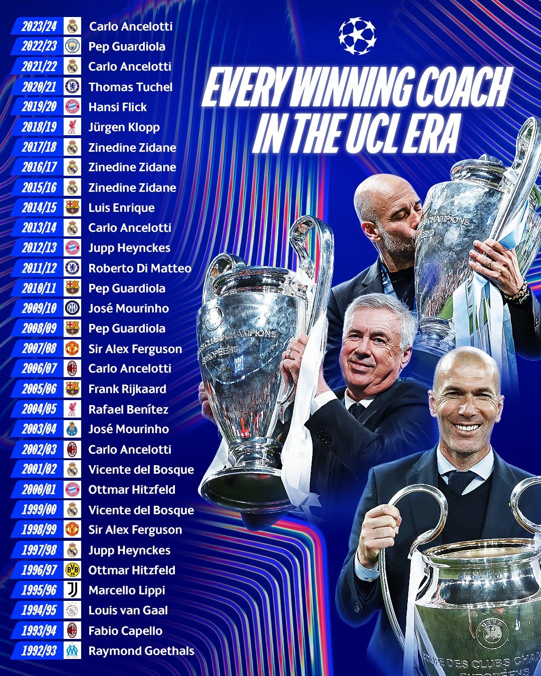 从92/93赛季欧冠改制至今,在过去32年的夺冠球队中,意大利和西班牙的主帅,一定是相对更为成功的教练代表。 毕竟,无论是90年代的米兰和尤文再到21世纪初期的米兰,还是皇萨这两支西班牙球队在欧冠的成功,其实背后都少不了的就是主帅的贡献。