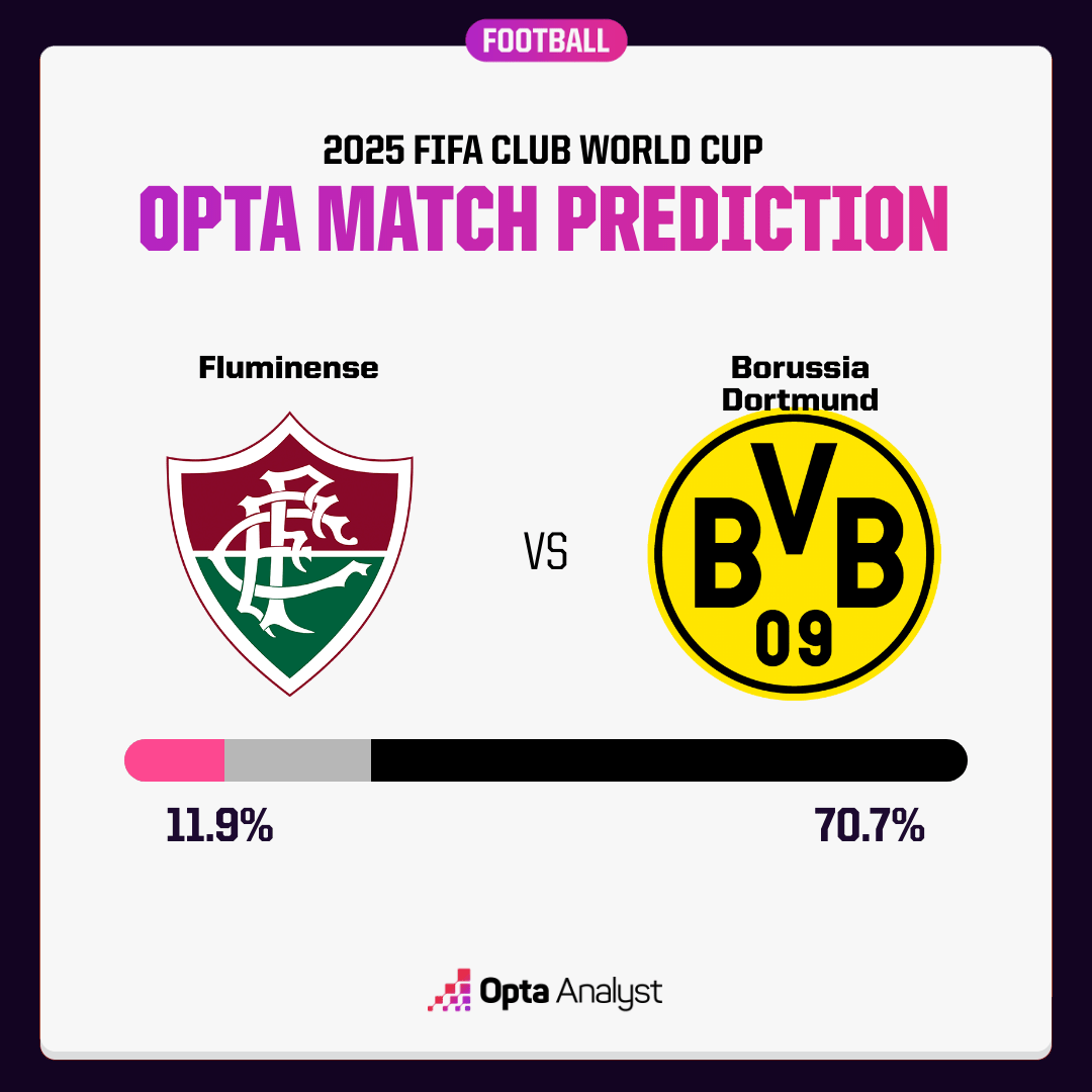 但在Opta的预测中,好像这也不是一场均势的对阵--弗鲁米嫩塞胜,11.9%;多特胜,70.7%;双方平局,17.4%。