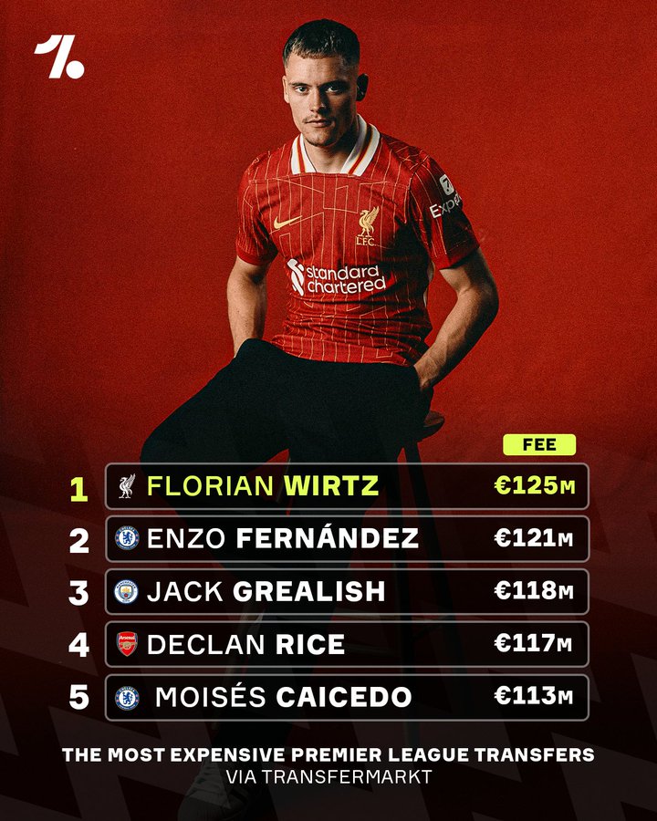 当然了,来自德转的显示,转会费达到了1.25亿欧元的维尔茨,也更是目前英超的第一转会身价。在榜单的前五名,其实目前的三大中场--恩佐,赖斯和凯塞多其实都还证明了自己的身价。但作为前场球员的格拉利什却迷失在了曼城。