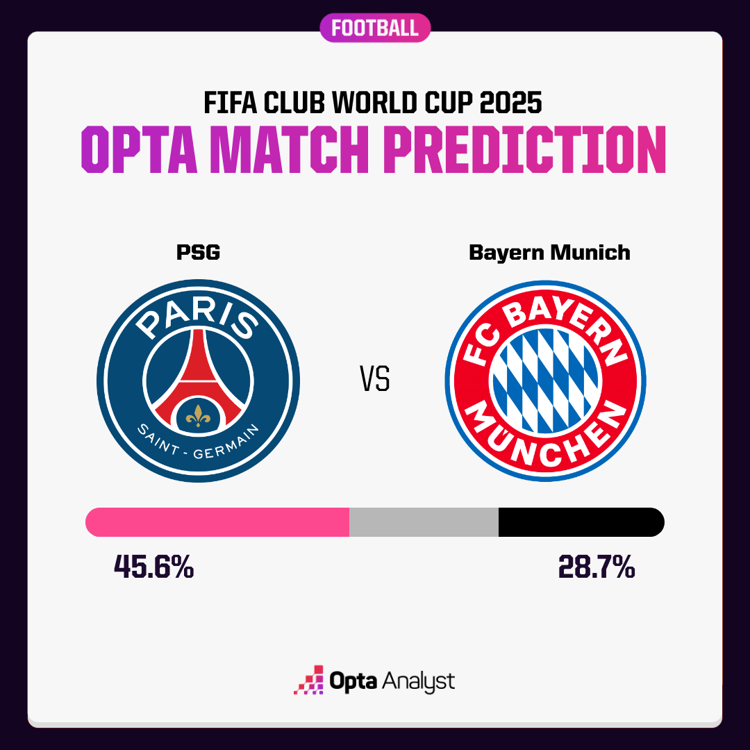 从Opta给出的预测来看,平局还真不是没可能--巴黎胜,45.6%;拜仁胜,28.7%;双方平局,25.7%。
