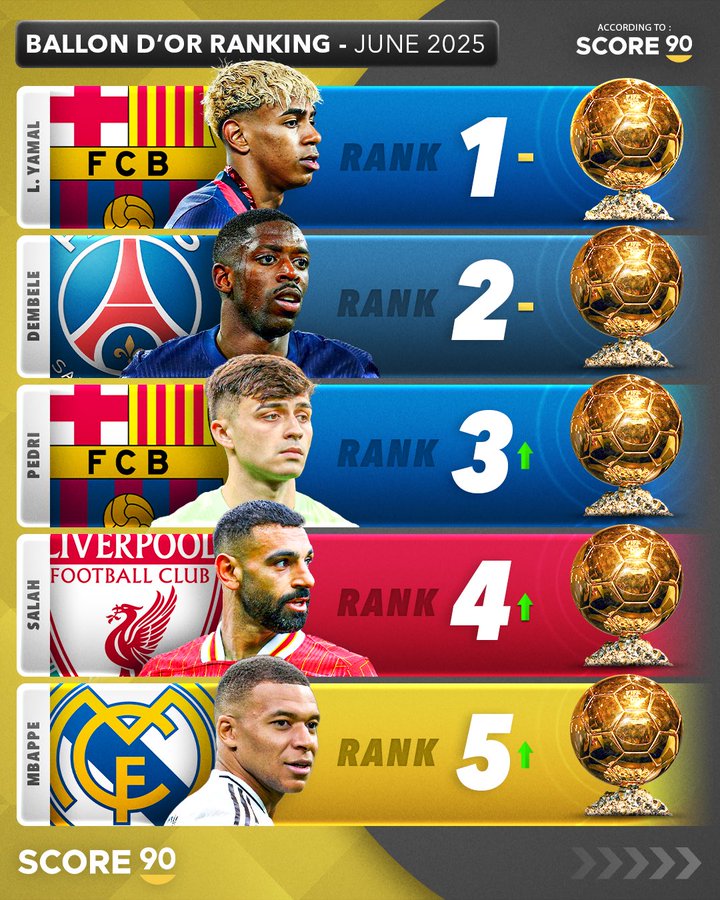 而在S90于6月10日发布的排名进行对比来看,其实前五人并没有发生任何变化,仅有的不同就是亚马尔同登贝莱的名次调换以及萨拉赫同姆巴佩的名次调整。