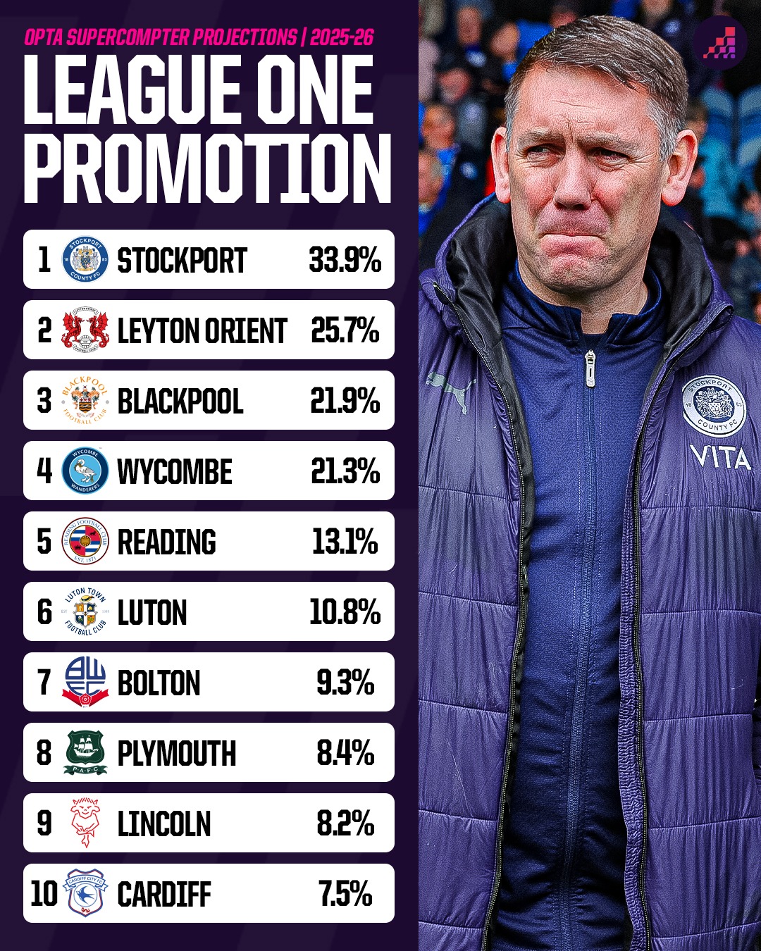 Opta发布英甲预测:斯托克波特郡&莱顿东方,或有望直通英冠