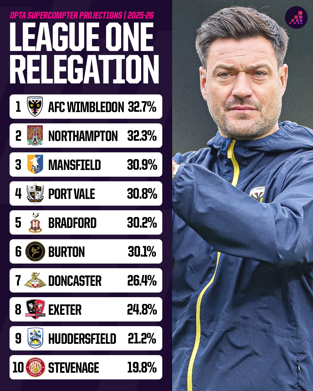 AFC温布尔登,北安普顿、曼斯菲尔德、维尔港、布拉德福德城和伯顿等6支球队的概率,全部超过了30%。