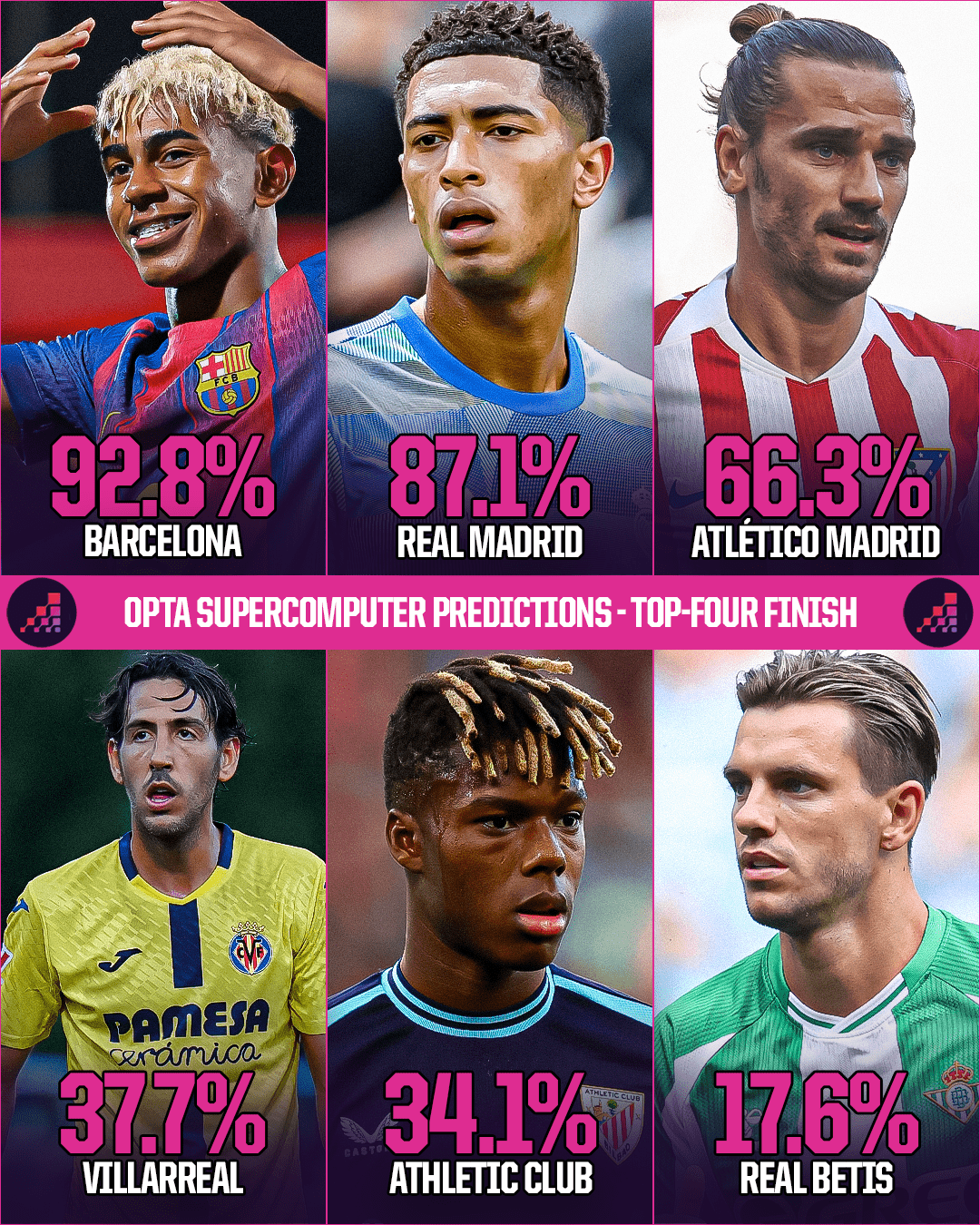 北京时间8月16日01:00,25/26赛季的西甲联赛将拉开帷幕。而在赛事开打前,Opta也按照惯例发布了对于新赛季西甲联赛的全面预测。