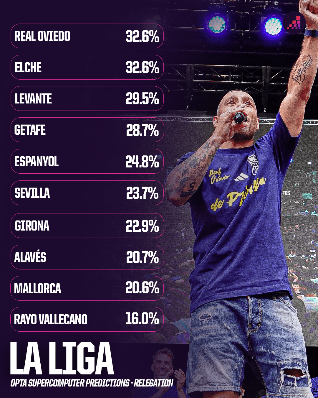 Opta,2025-2026赛季西甲联赛排名,争冠、前四及降级等热门事项的全面预测