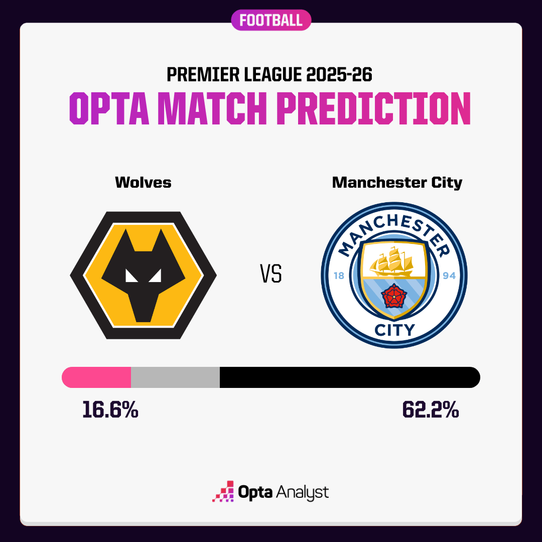 Opta对于本场的预测其实支持的方向很明确--狼队胜,16.6%;曼城胜,62.2%;双方平局,21.2%。