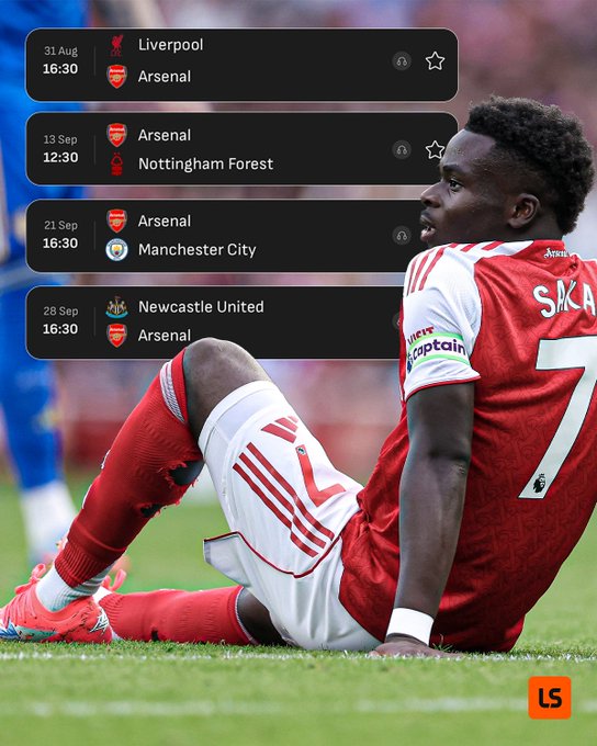 英超第3-6轮,阿森纳将开启魔鬼赛程--他们将接连对阵利物浦,诺丁汉森林,曼城以及纽卡斯尔等一众强敌。但仅从目前萨卡的缺阵时间来看,或许这些赛事都很难看到他的身影了。