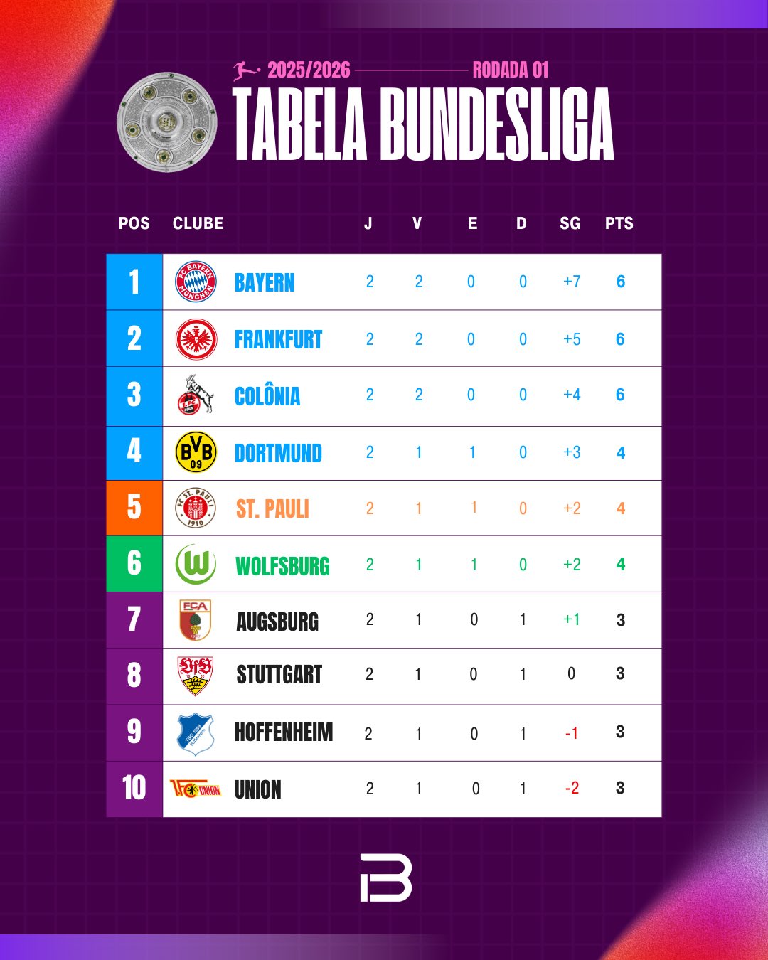 截止前两轮联赛战罢,拜仁、法兰克福和科隆均取得了两战全胜的6分成绩,而目前拜仁则是以净胜球的优势领跑积分榜。