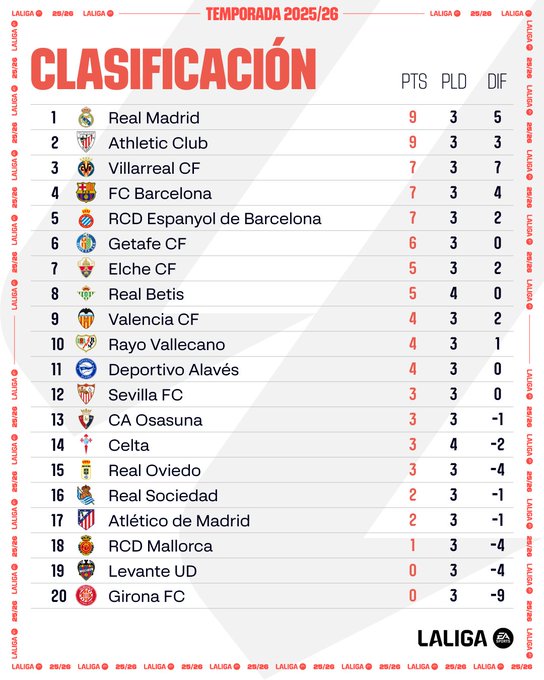 截止第三轮比赛全部战罢,三战全胜的皇马和毕尔巴鄂目前以9分的成绩领跑积分榜(皇马以净胜球的优势暂列第一),而紧随其后的比利亚雷亚尔和巴塞罗那。