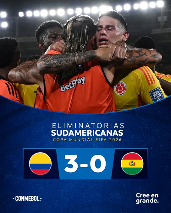 依靠J罗,科尔多瓦和金特罗的三粒进球,哥伦比亚主场3球横扫玻利维亚,拿到了本场比赛的更终胜利;