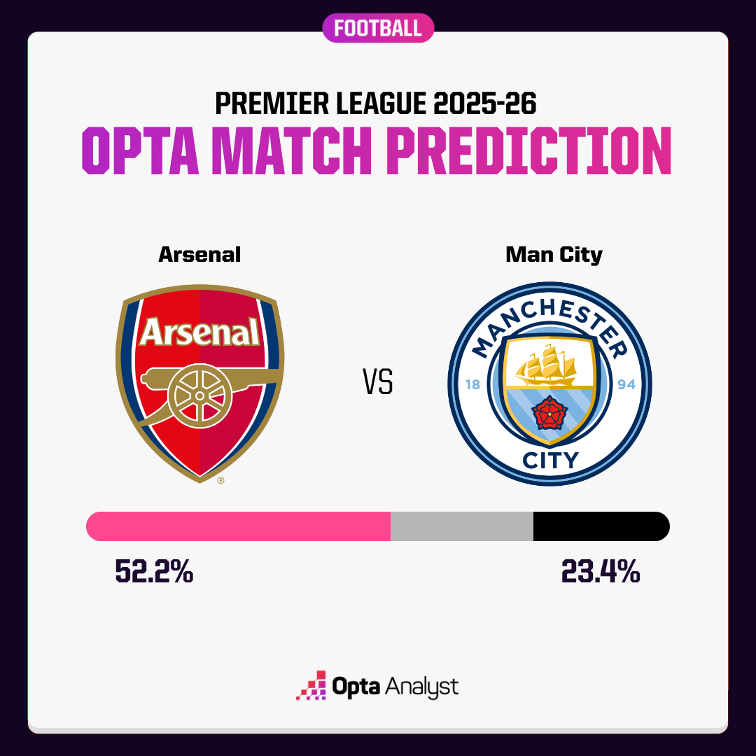 而在本场的预测中,Opta将更多的支持给予了主队--阿森纳胜,52.2%;曼城胜,23.4%;双方平局,24.4%。