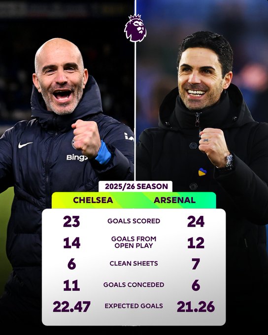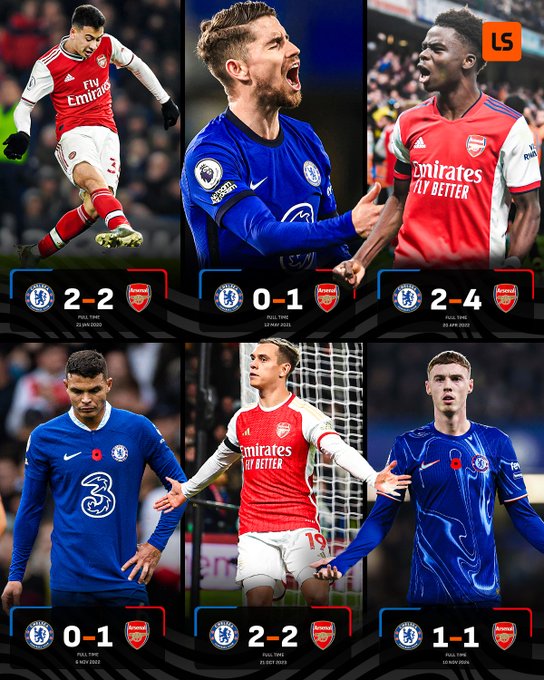 毕竟,在此前4次阿森纳在英超积分榜领先的情况下与切尔西交锋,他们全部获得了胜利--03年1月3-2获胜,04年2月2-1获胜,07年12月1-0获胜,24年4月5-0获胜。