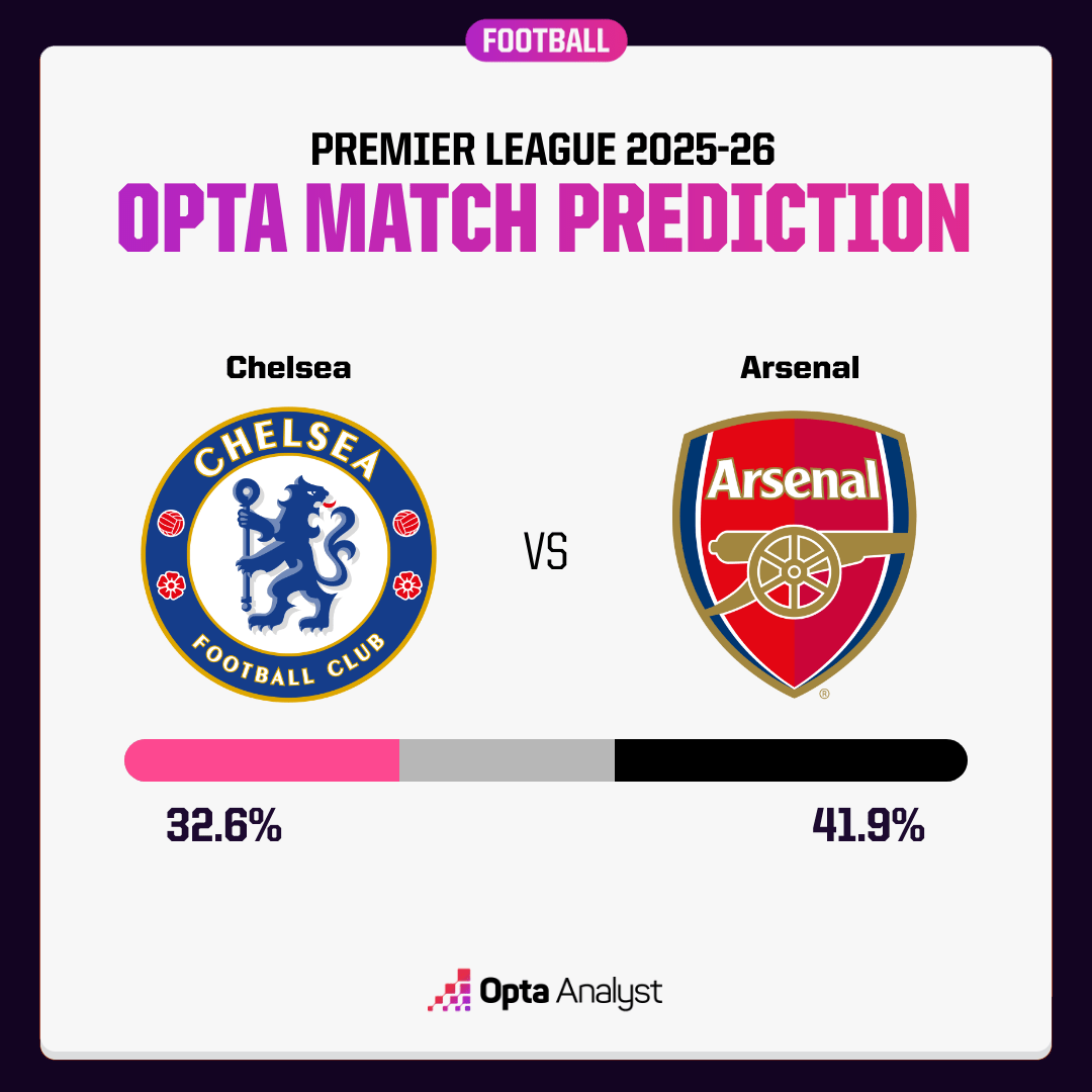 所以,在Opta对于本场的预测中,客队无疑成为了更大概率的获胜方--切尔西胜,32.6%;阿森纳胜,41.9%;双方平局,25.5%。