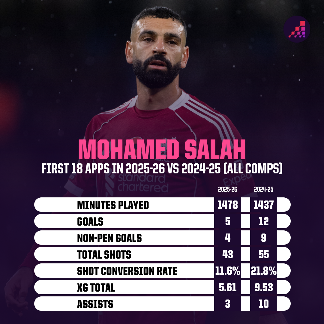 本赛季代表利物浦出场18次而16场第一发的萨拉赫,仅有5球3助攻的成绩单。而在上赛季同样出战18场而时间还少41分钟的同期数据对比中,却是12球10助攻的两双数据。