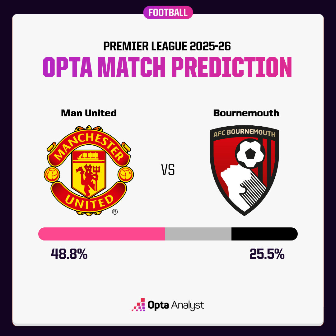 Opta还是挺看好红魔的--曼联胜,48.8%;伯恩茅斯胜,25.5%;双方平局,25.7%。