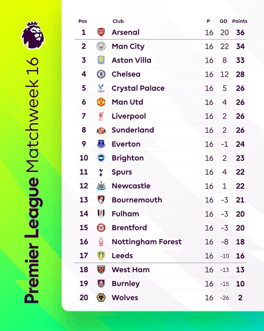 截止前16轮联赛战罢,阿森纳、36,曼城、34和维拉、33位列前三甲,切尔西28分排名第4。水晶宫,曼联、利物浦和桑德兰4支球队同积26分仅以净胜球差别位列第5-8位。