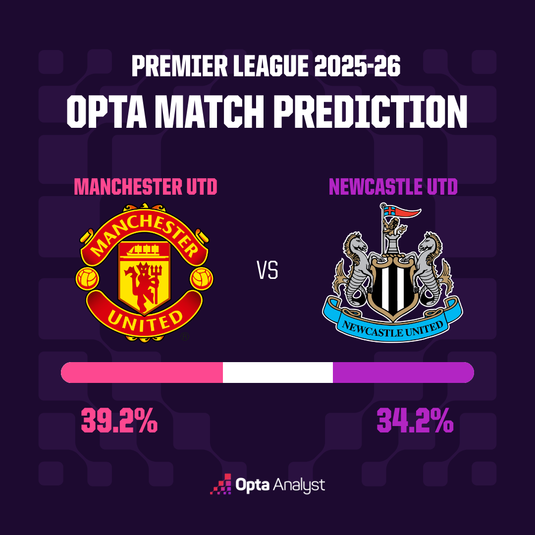 从Opta给出的预测来看,势均力敌可能是赛前对于本场更大势所趋的一种预测--曼联胜,39.2%;纽卡胜,34.2%;双方平局,26.6%。