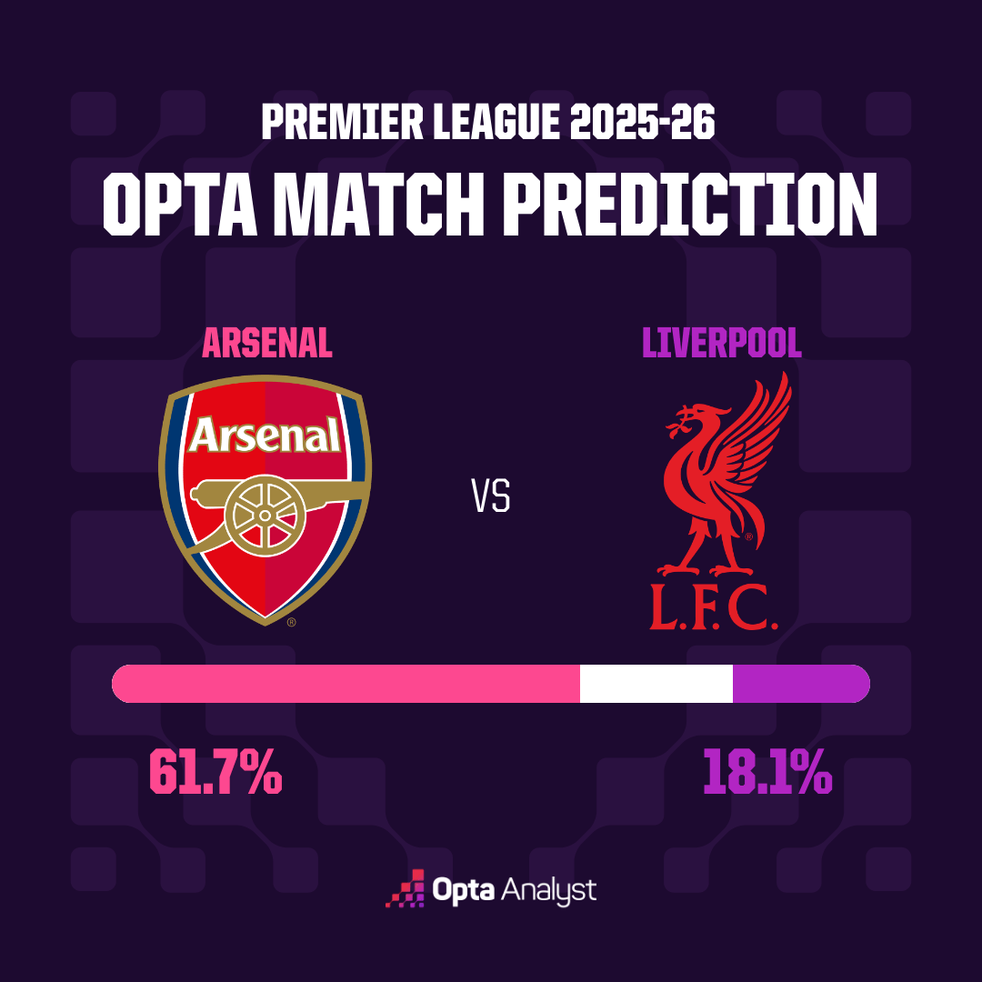 从Opta给出的预测来看,他们完全看好枪手--阿森纳胜,61.7%;利物浦胜,18.1%;双方平局,20.2%。