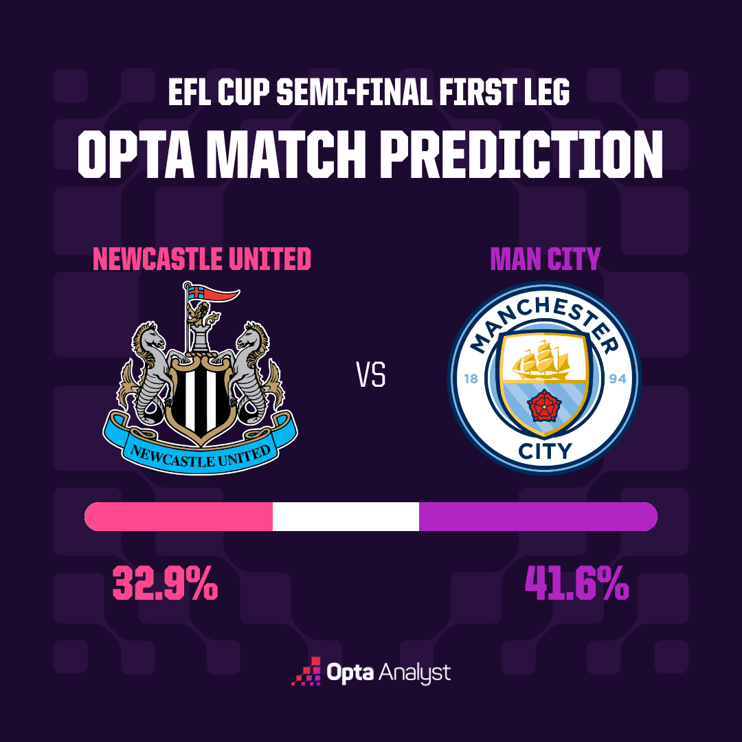 所以,在Opta针对本场的预测中,这其实就是一场平分秋色的对话--纽卡胜,32.9%;曼城胜,41.6%;双方平局,25.5%。