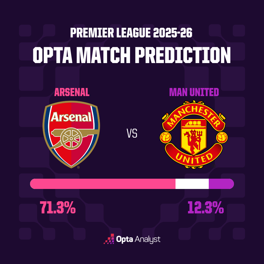 所以,在Opta的预测中,主队无疑占据了极大的优势--枪手胜,71.3%;红魔胜,12.3%;双方平局,16.4%。
