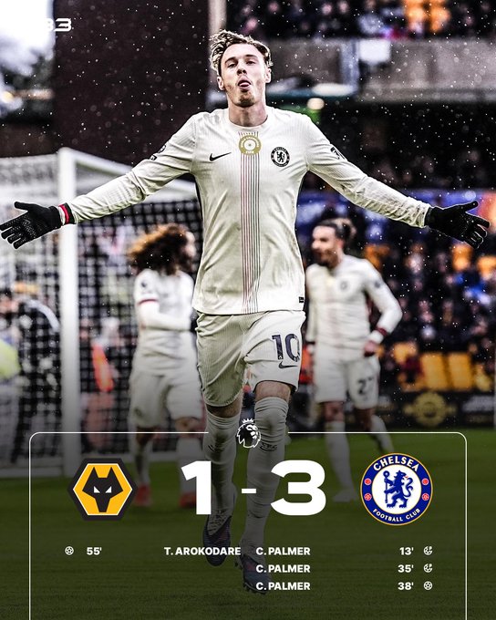 虽然这是一场客场作战,但切尔西凭借第13,35和38分钟的这25分钟之内帕尔默的帽子戏法(前两粒进球均为若昂-佩德罗造点),在比赛进行还不到40分钟的时候就已经锁定了胜局;
