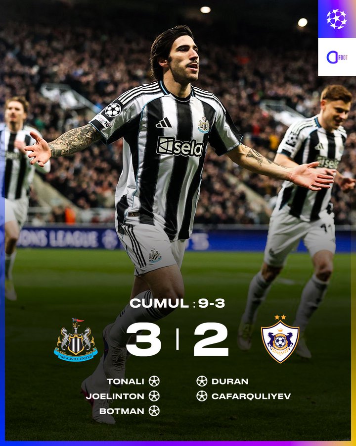 纽卡斯尔3-2卡拉巴赫(纽卡斯尔总比分9-3晋级)