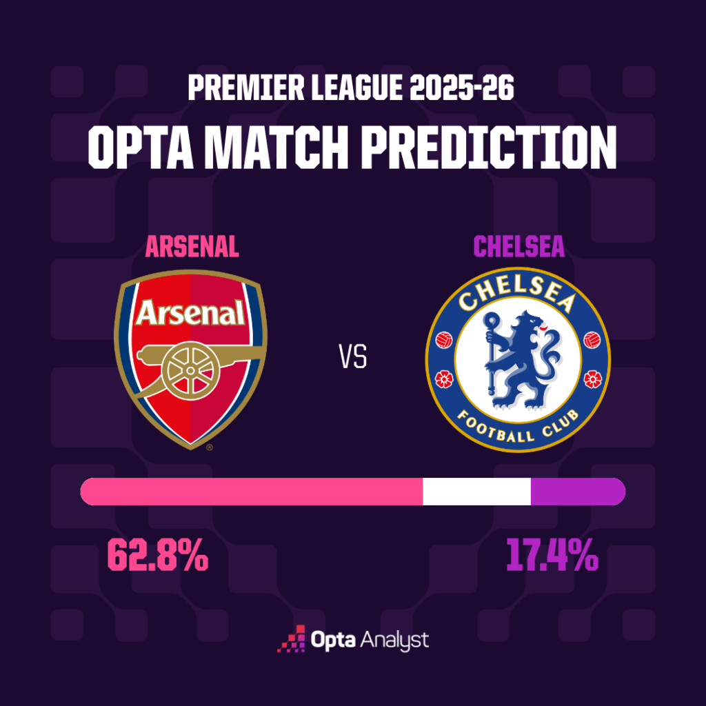 只不过,从Opta给出的预测来看,蓝军并不被看好--枪手胜,62.8%;蓝军胜,17.4%;双方平局,19.8%。
