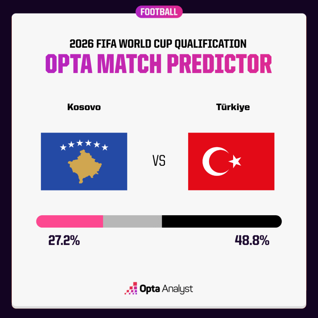 北京时间4月1日02:45开始,2026美加墨世界杯欧洲区和洲际附加赛更终的6场决赛较量就将开启。而在赛前,Opta也按照惯例发布了对于各场赛事的预测。
