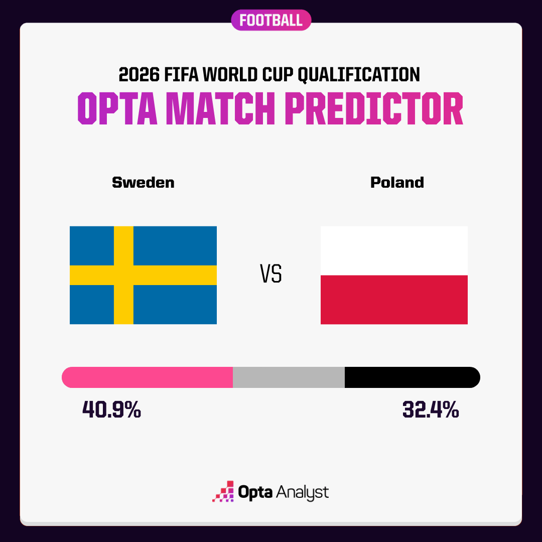 而从Opta对于6场世预赛的预测来看,瑞典对阵波兰的比赛,无疑是更为激烈的对决。毕竟,平局预测概率甚至已经达到了32.5%的情形,也让双方看上去几乎很有可能要出现加时甚或点球大战的情形;