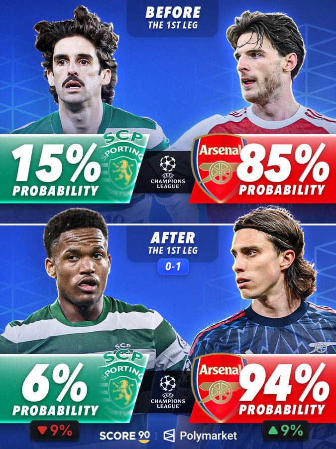 其实,葡体和枪手的对决,葡体从一开始就是不被看好的、15%的可能性晋级半决赛。而如今,随着阿森纳在客场凭借哈弗茨的绝杀从而奠定了客场1-0的优势之后,葡体的概率已经降至6%而枪手的概率则来到了94%!