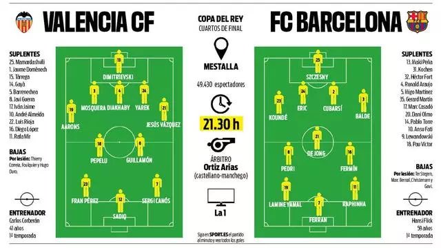 北京时间2月7日04:30,在国王杯1/4决赛的对决中,巴萨将前往梅斯塔利亚球场客场迎战瓦伦西亚而争夺一个半决赛的名额。