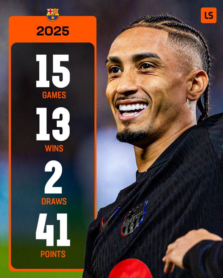 对巴萨而言,2025年度的西甲联赛球队取得了13胜2平的不败成绩,拿到了45分当中的41分。正因此,巴萨才能一直领先皇马占据积分榜第一名的位次。