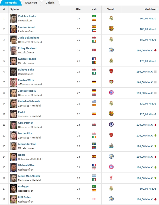 在德转更新的球员身价的排名中,目前共有18位球员的身价达到了至少1亿欧元,而更高的则是2亿欧元的维尼修斯,紧随其后的则是1.8亿欧元的亚马尔以及贝林厄姆和哈兰德等三人。