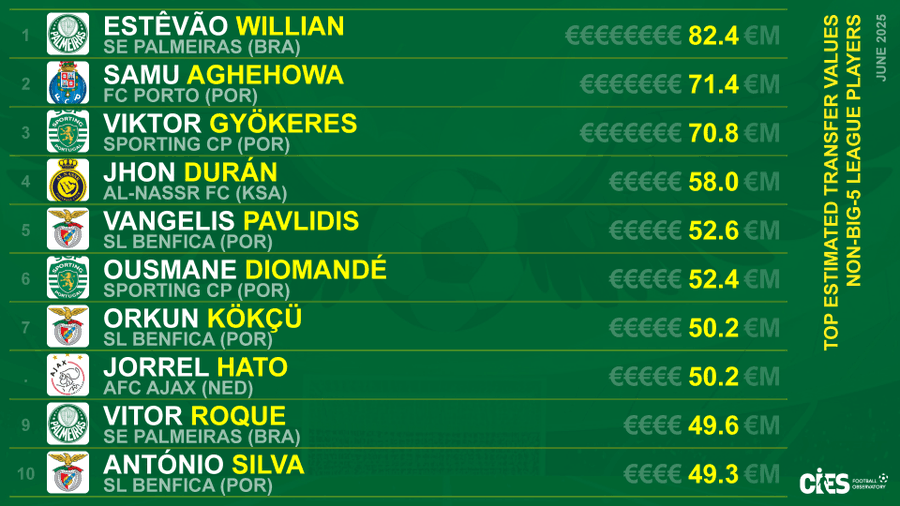 在针对于非五大联赛的球员转会价值的统计中,来自于帕尔梅拉斯的18岁巴西小将埃斯特旺,以8240万欧元的身价排名第一。