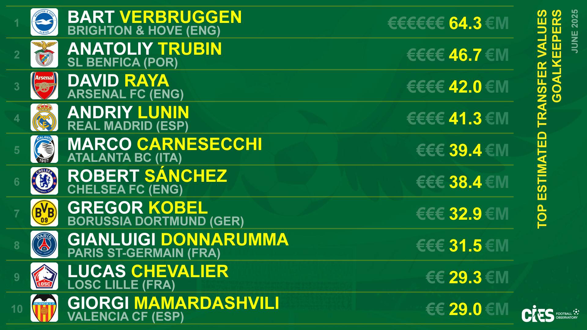 在关于门将的统计中,目前效力于布莱顿的22岁的荷兰门将费布鲁亨,以6430万欧元的身价排名第一,遥遥领先于身后的拉亚,科贝尔以及多纳鲁马等人。