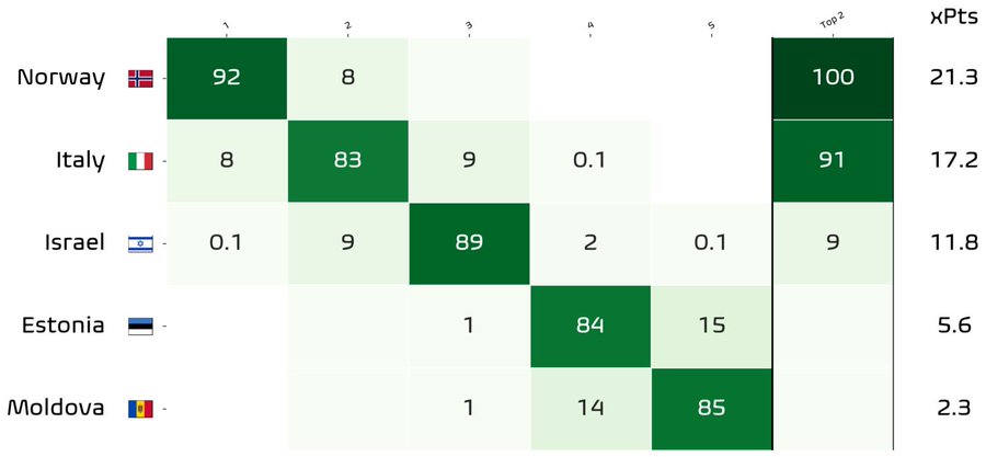 只不过,意大利其实还需提防以色列的出色发挥才行。毕竟,预测显示,以色列其实也有9%的概率能够拿到第二名!