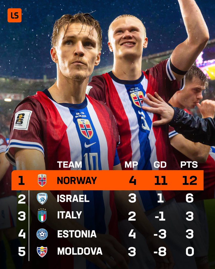 但更值得关注的无疑是I组,目前4连胜的挪威拿到了12分位居小组第一,而如此情形也意味着,如果挪威和以色列延续如此表现的话,或许意大利无缘2026美加墨世界杯将不再是很大的意外了。
