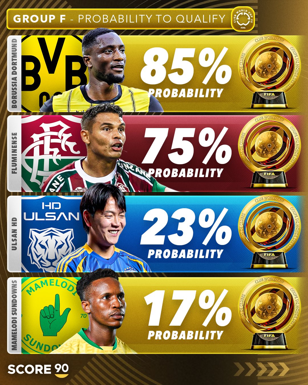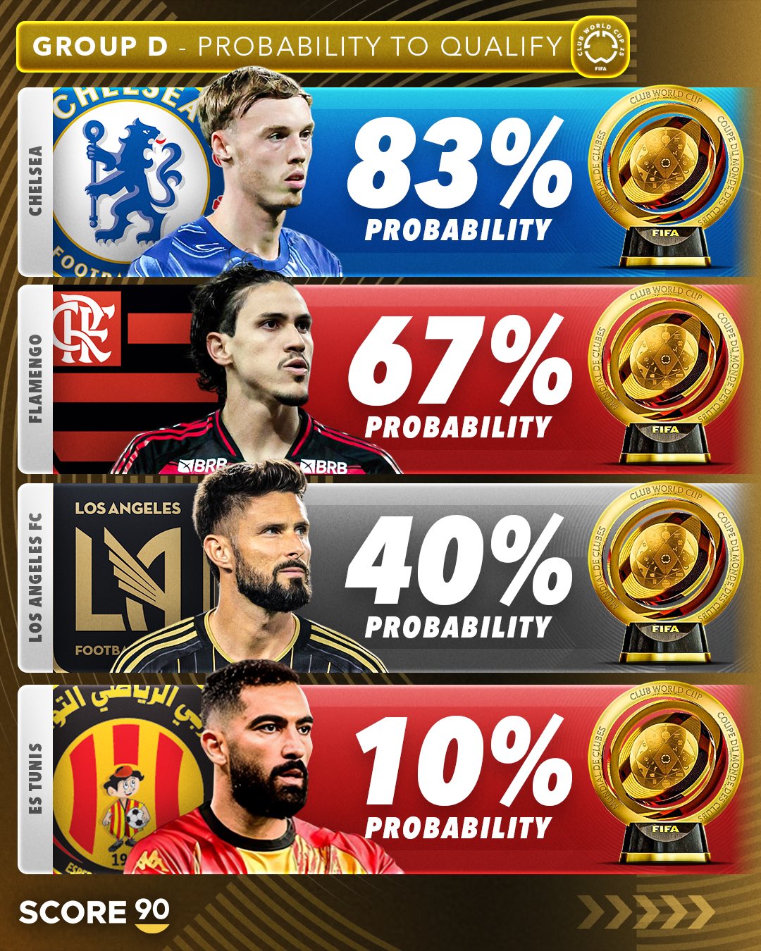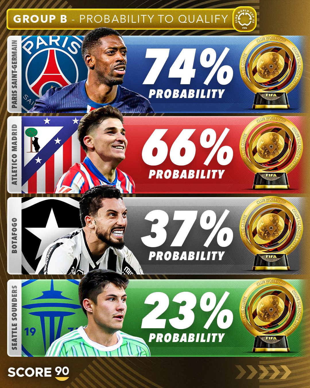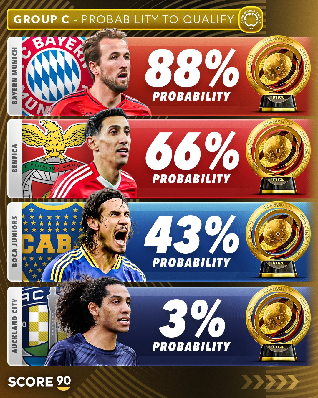 即Opta的数据预测之后,足球媒体SCORE 90也在日前发布了世俱杯8个小组的出线概率预测。