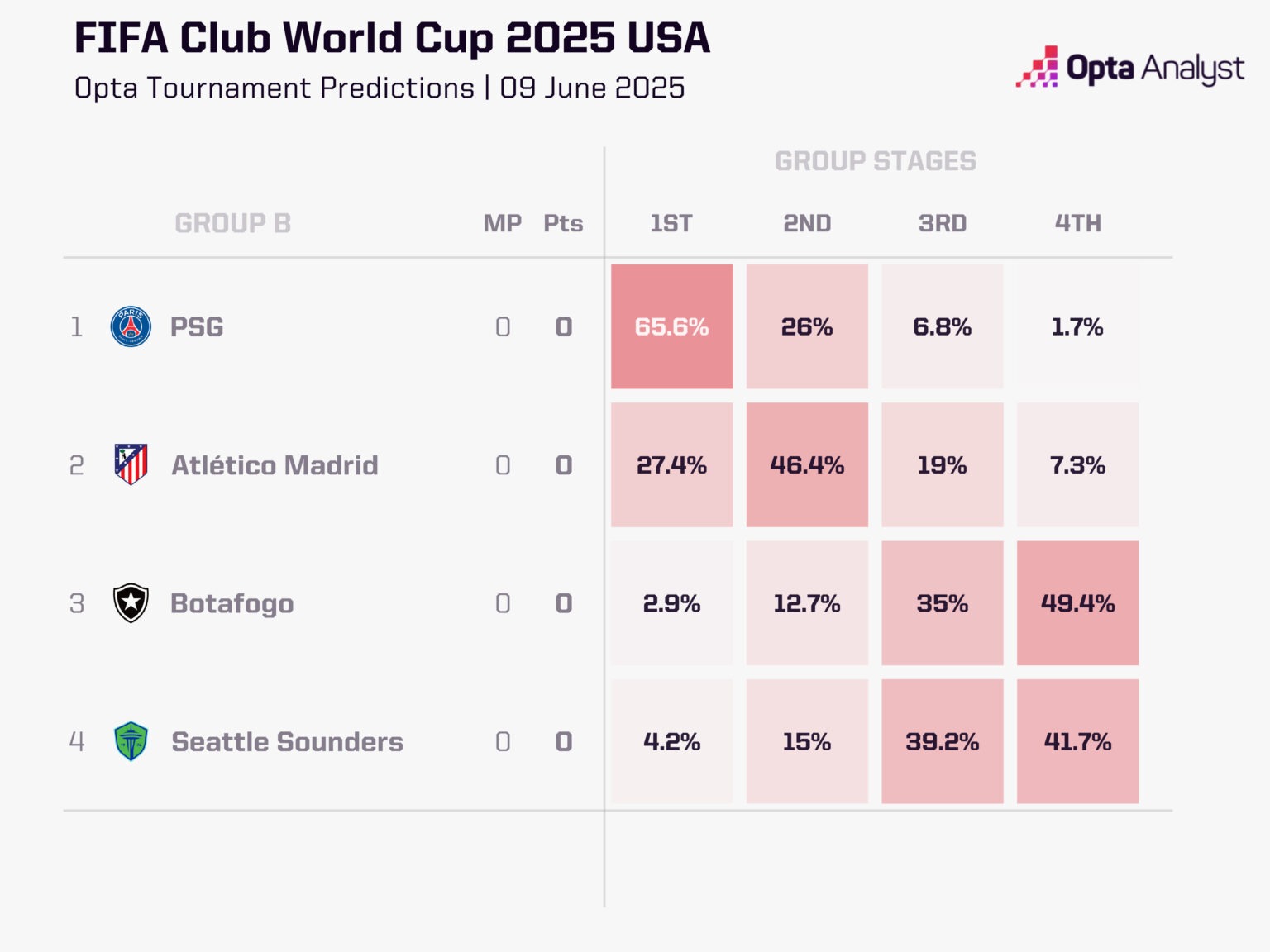 来自Opta和SCORE 90的预测都显示,巴黎是本小组更有可能获得第一名的球队。而如若巴黎如愿以偿拿到小组第一的话,可能晋级半决赛的难度也会减少--1/8决赛对阵A组第二,1/4决赛对阵D1和C2之间的胜者(目前来看极有可能是切尔西)。