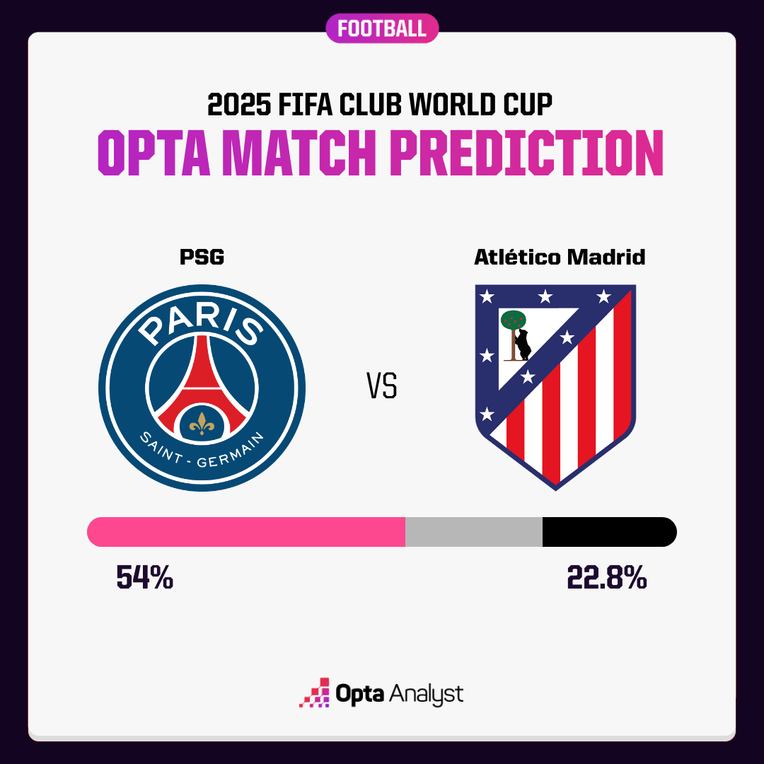 来自Opta的预测显示,其实本场更有可能的获胜者还是主队--巴黎胜,54%;马竞胜,22.8%;双方平局,23.2%。