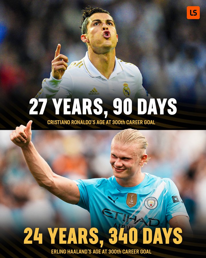 据统计,哈兰德打进300球时仅有24岁340天,而C罗却实在27岁90天才完成了这一成就。
