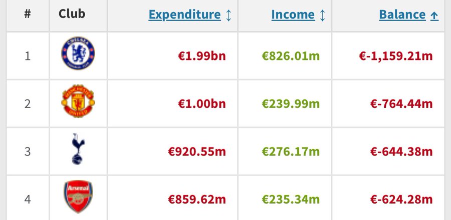 但更高的当属切尔西,过去5年的投入已来到了19.9亿欧元!