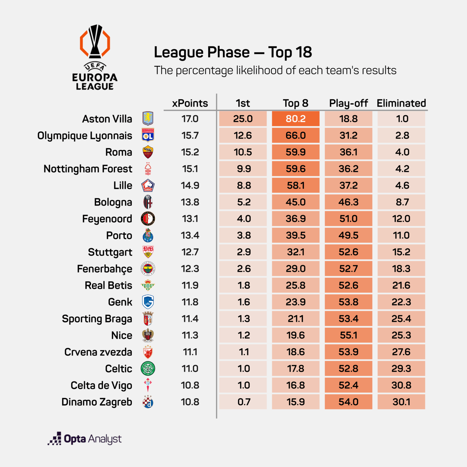 北京时间9月25日00:45开始,2025-2026赛季的欧联杯联赛阶段的较量就将开启。而在欧联杯的开打赛前,Opta也按照惯例发布了对于新赛季欧联杯的详细预测。
